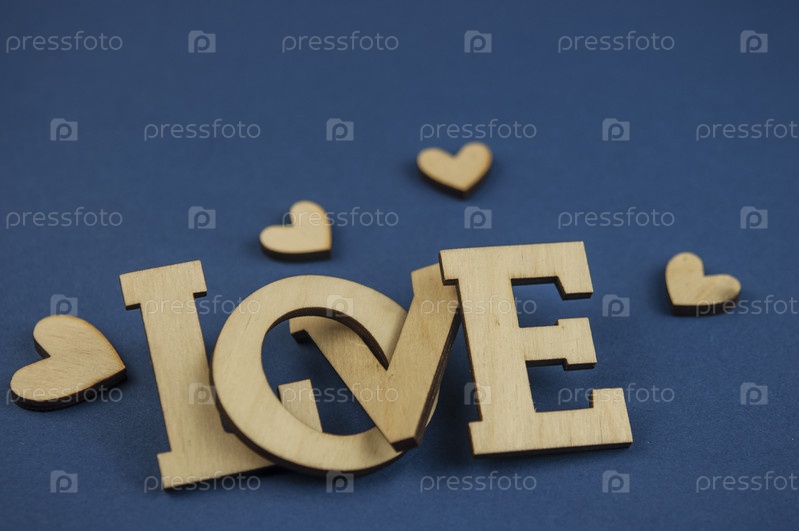 Любовное слово, маленькие сердечки на темно-синем бумажном фоне. Вид сверху на День святого Валентина