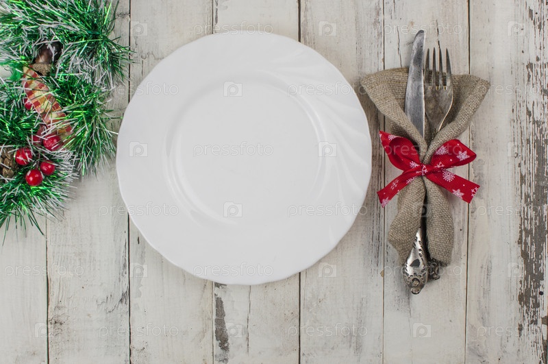 Праздничная композиция с пустой синей тарелкой и столовыми приборами на деревенском белом деревянном столе. Настройки стола. Вид сверху