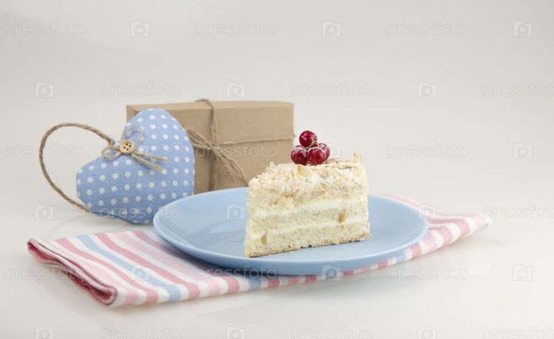 Вкусный кусок торта на тарелке на белом фоне