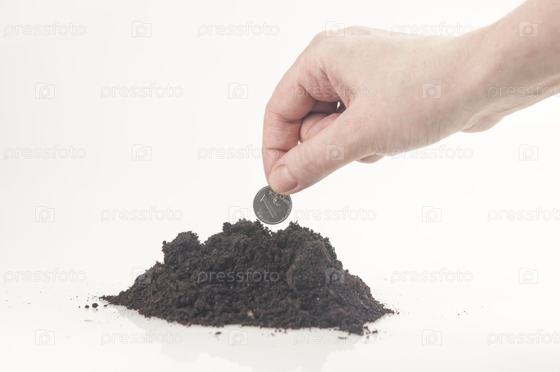 Женская рука опускает монету в землю на белом фоне