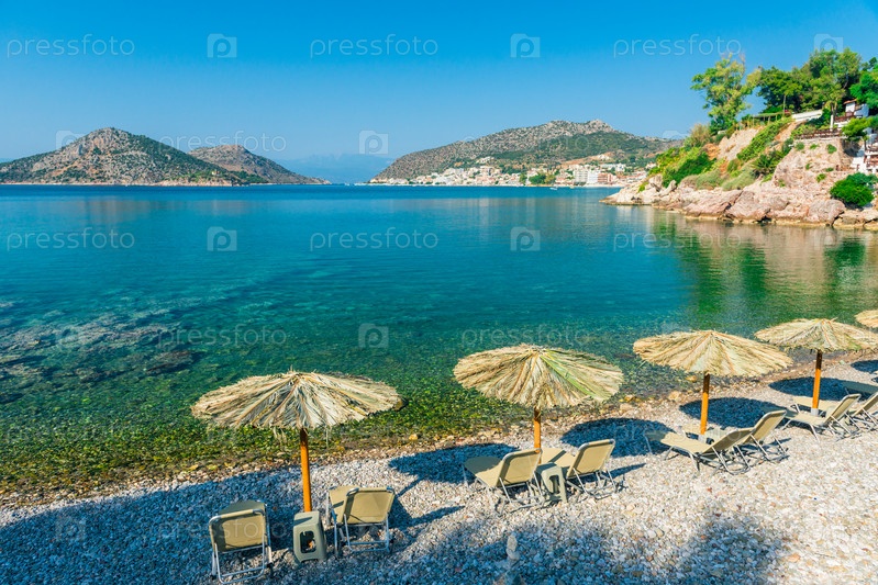 Соломенные зонтики на песчаном морском пляже на экзотическом курорте