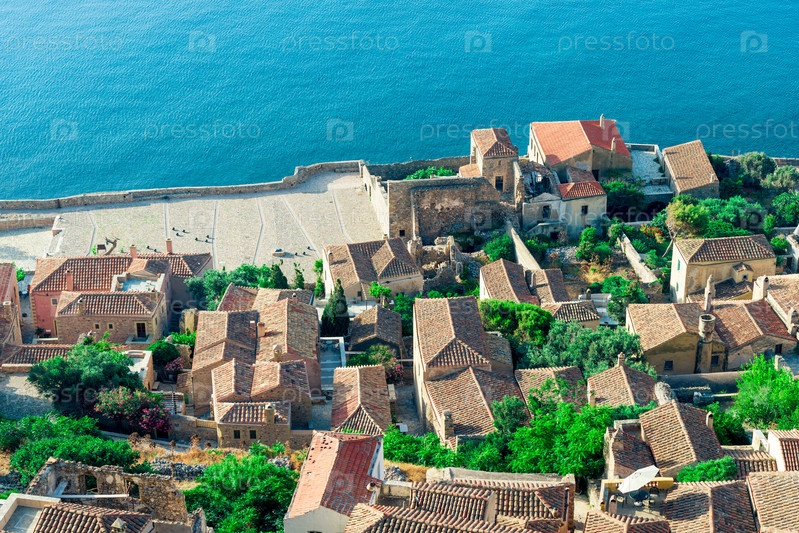 Романтическая укрепленная греческая деревня на скалистом острове Монемвасия, Пелопоннес, Греция