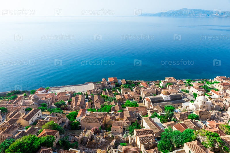 Романтическая укрепленная греческая деревня на скалистом острове Монемвасия, Пелопоннес, Греция
