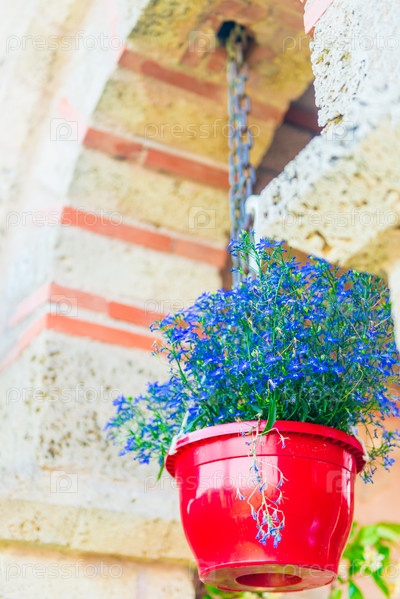 Кирпичная стена с окнами и цветами в горшках