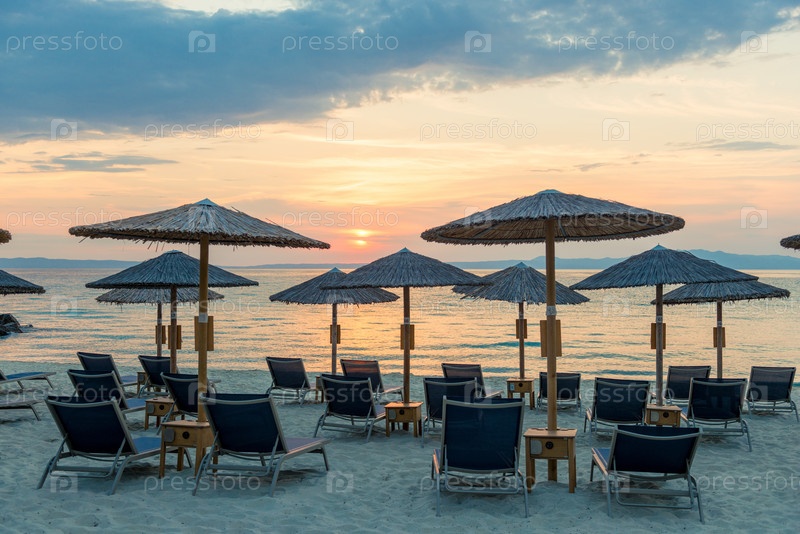 Красивый морской пейзаж заката с шезлонгами и зонтиком на побережье, Греция