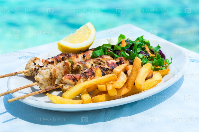 Куриный шашлык на шпажке в белой тарелке с картофелем