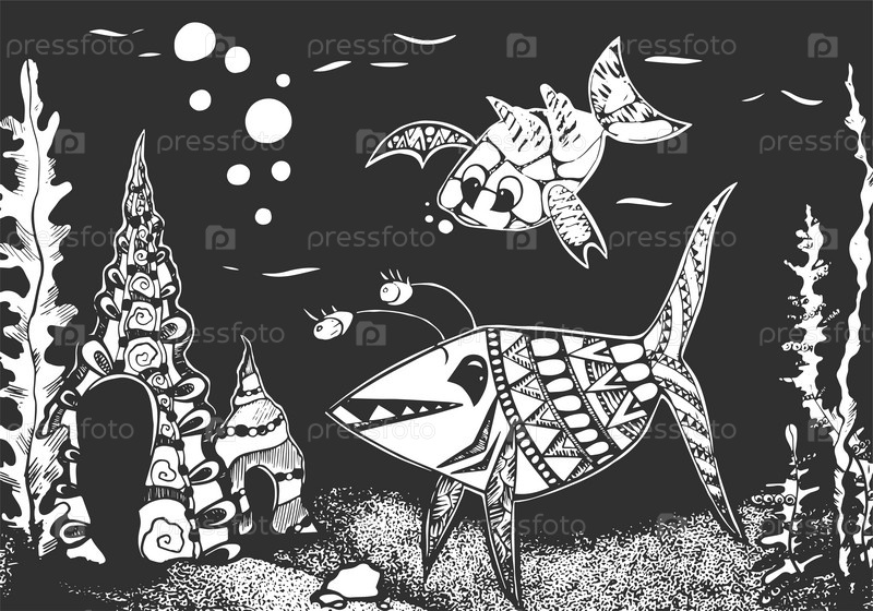 Фантастическая векторная иллюстрация с рыбами. Красивые рыбьи чернила. Рыба в воде с чернилами и ручкой. Детская иллюстрация. Морской мир. Книжная обложка. Иллюстрация к книге. Черно-белая графика