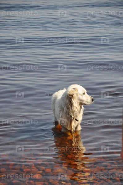Белая собака. Собака у воды. Плавание с собакой. Животное на пляже. Мокрая собака расслабляется