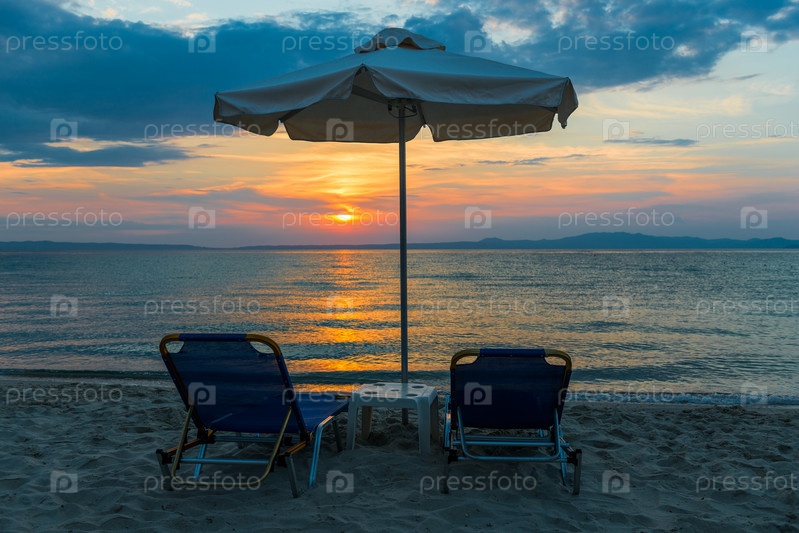 Красивый морской пейзаж заката с шезлонгами и зонтиком на побережье, Греция
