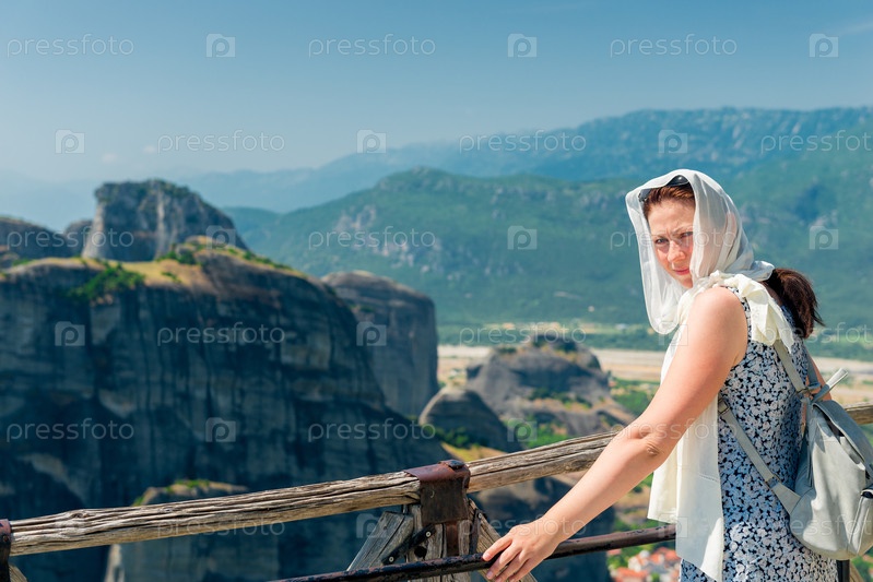 Молодая женщина в платье стоит на стене перед метеоритными горами греции