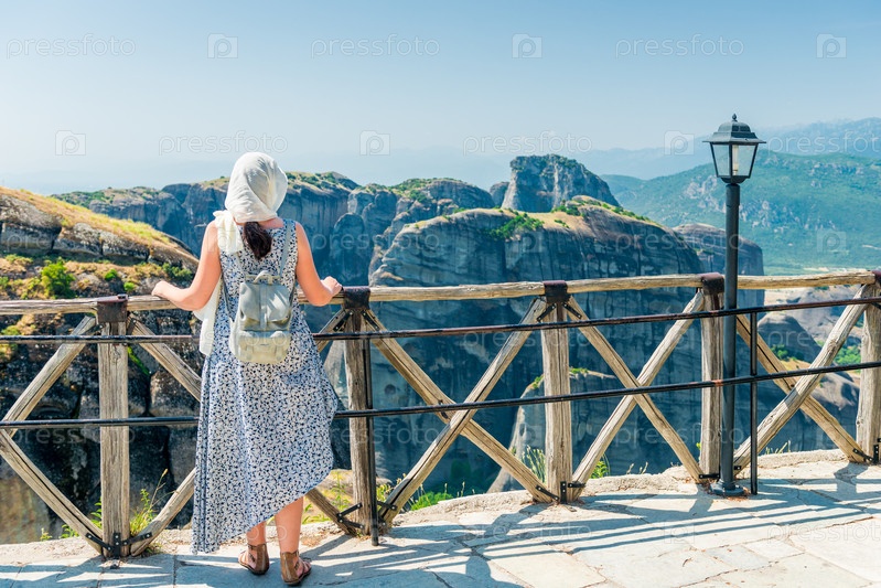 Молодая женщина в платье стоит на стене перед метеоритными горами греции