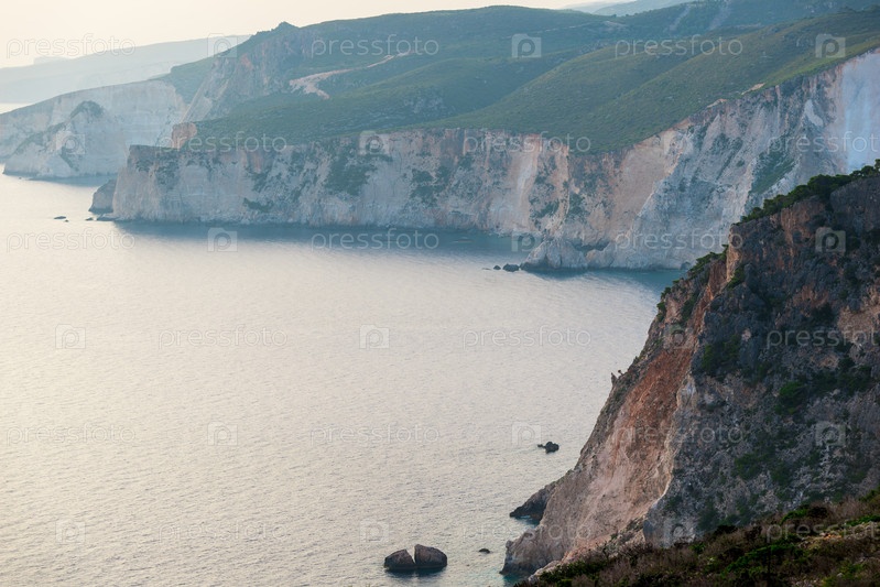 Береговая линия с морем, горами, каньоном и скалами с закатным светом, Греция