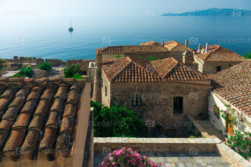 Романтическая укрепленная греческая деревня на скалистом острове Монемвасия, Пелопоннес, Греция
