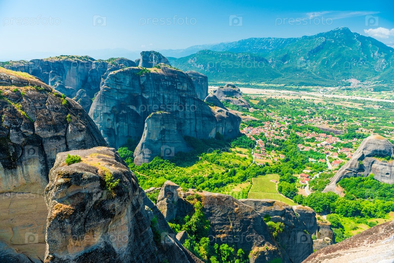Огромные серые метеоры утесов в Греции среди зеленого горного леса