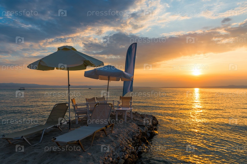 Красивый морской пейзаж заката с шезлонгами и зонтиком на побережье, Греция