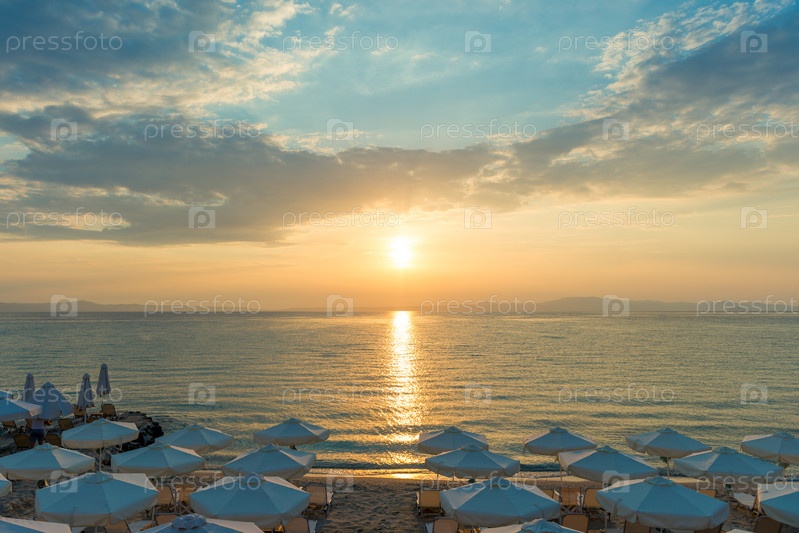 Красивый морской пейзаж заката с шезлонгами и зонтиком на побережье, Греция