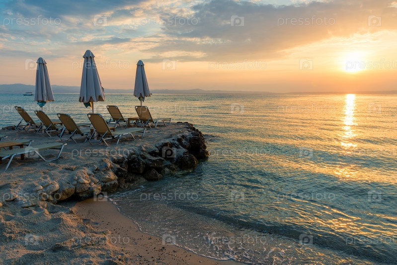 Красивый морской пейзаж заката с шезлонгами и зонтиком на побережье, Греция
