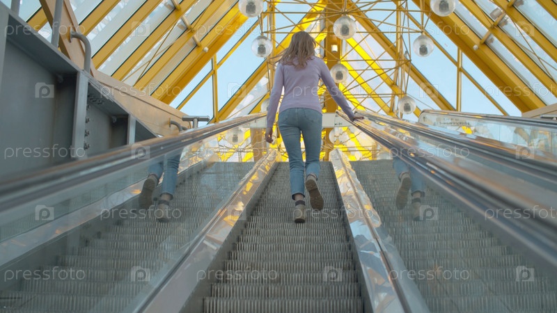 Молодая женщина поднимается по движущемуся эскалатору. Вид сзади, след. Блондинка с длинными волосами внутри современного здания