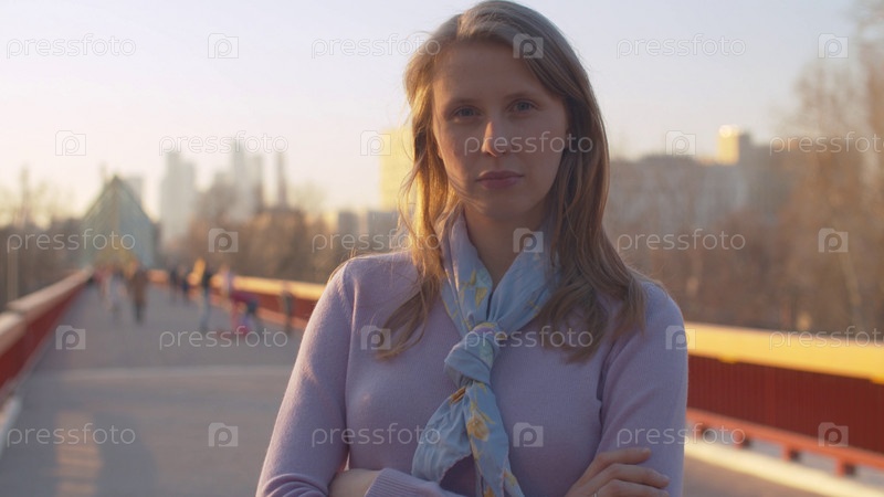 Хороший портрет молодой женщины на закате на фоне города. Она стоит на мосту. Размытые люди медленно идут по мосту