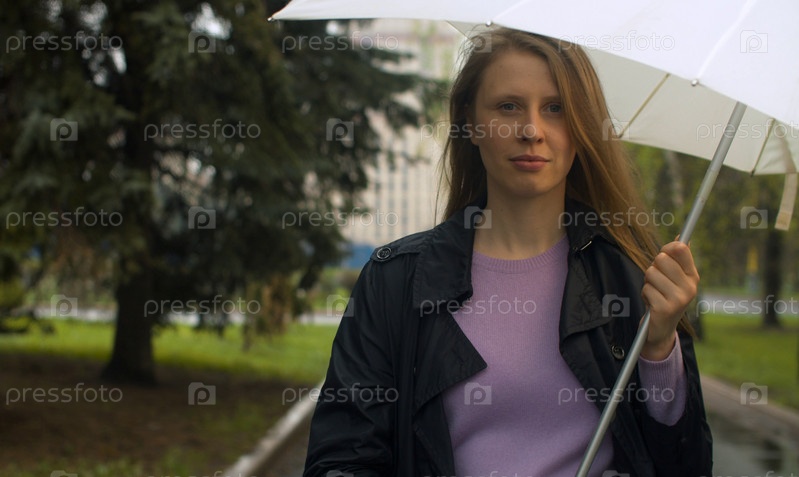 Портрет серьезной молодой женщины с зонтиком под дождем в парке