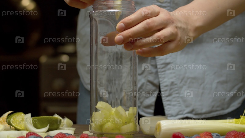 Женщина кладет нарезанный сельдерей в стакан блендера