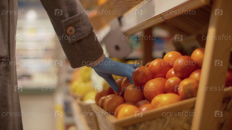 Женская рука выбирает апельсины в супермаркете