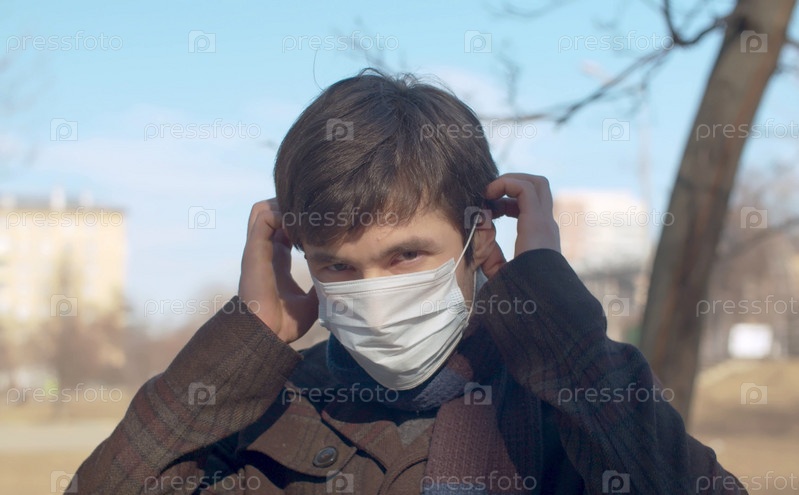 Большой план портрета молодого красивого мужчины, носящего защитную маску на улице в городе. Солнечный весенний день. Защитите себя и своих близких. Пандемия COVID-19