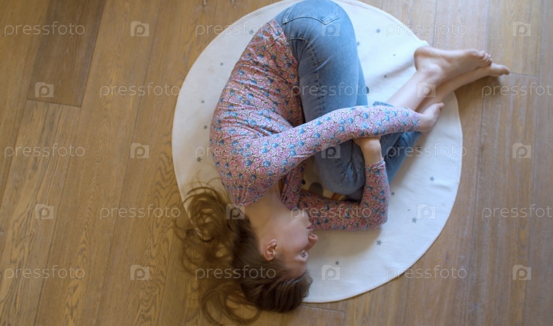 Женщина лежит на круглом ковре, вид сверху. Круглый ковер с надписью - это мое счастливое место. Символ личного пространства