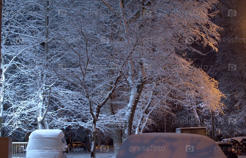 Белое заснеженное дерево на фоне темно-синего вечернего неба. Снег блестит в свете фонарей