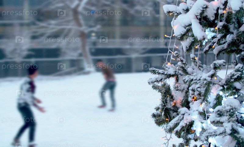 Подростки играют в снежки возле елки
