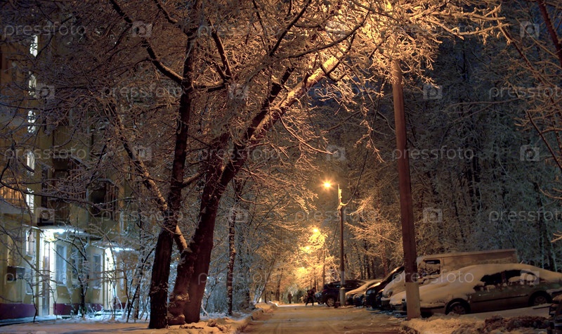 Городской двор после снегопада. Красивые деревья покрыты недавно выпавшим снегом. Свежий снег лежит на земле и автомобилях. Свет фонарей. Дворник чистит дорогу от снега