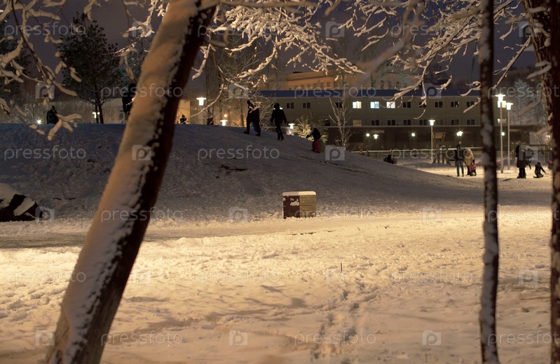 Дети гуляют в парке со свежим снегом после снегопада