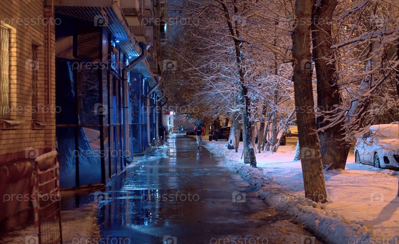 Городская улица зимней снежной ночью