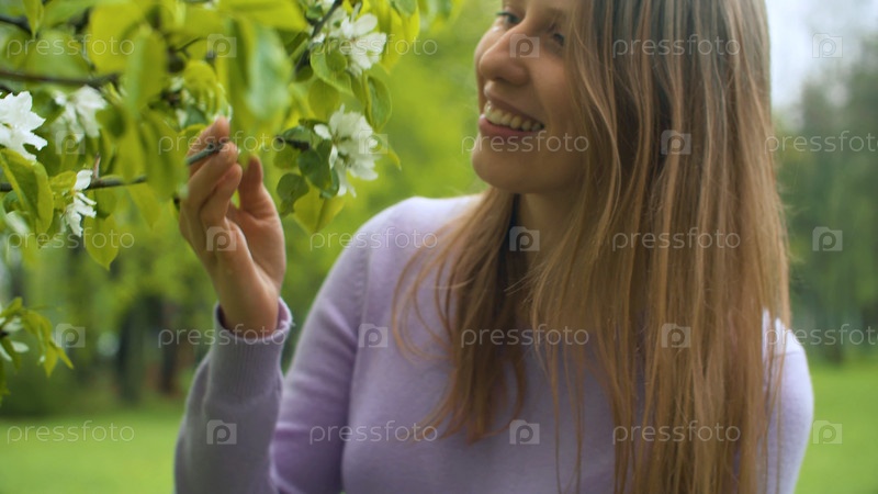 Крупным планом портрет счастливой женщины возле цветущей яблони. Она наблюдает за цветами. Красота в природе. Настоящие люди