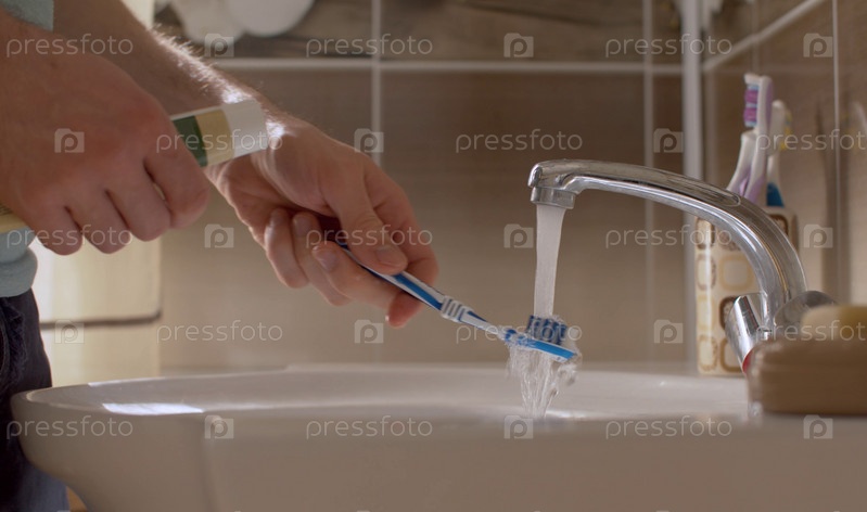 Молодой человек чистит зубы в красивой ванной. Закройте мужские руки зубной пастой и зубной щеткой. Ежедневные гигиенические процедуры