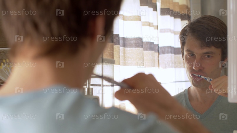 Мужчина чистит зубы в красивой ванной. Закройте лицо молодого красавца, отраженного в зеркале. Ежедневные гигиенические процедуры