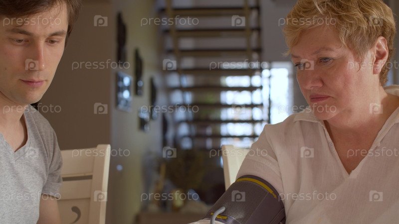 Сын измеряет артериальное давление пожилой матери дома. Молодой человек помогает пожилой женщине проверить давление с помощью медицинского тонометра. Концепция здравоохранения