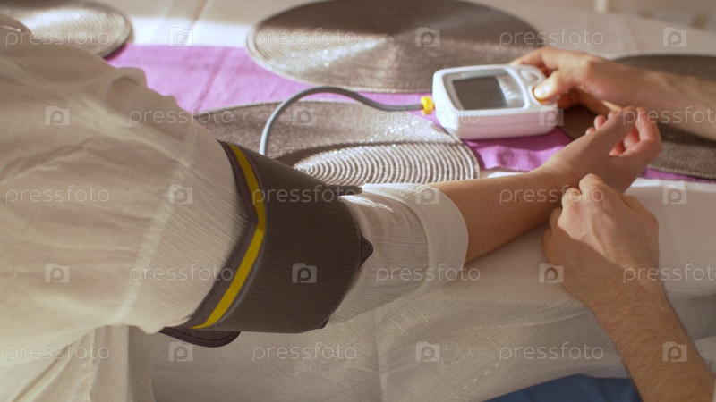 Закройте руки молодого человека для измерения артериального давления старшей матери дома. Концепция здравоохранения