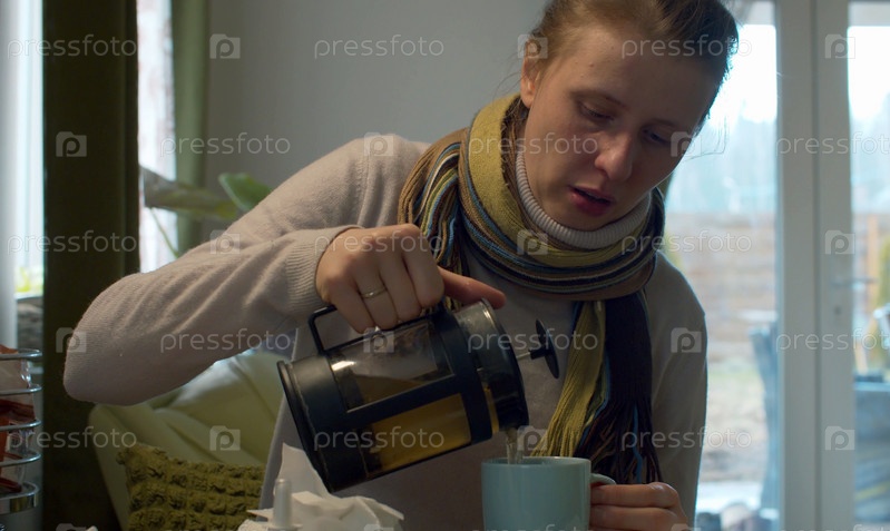 Женщина с гриппом лечится горячим зеленым чаем. Она наливает чай в чашку. Натуральное лечение гриппа. Чашка горячего напитка крупным планом