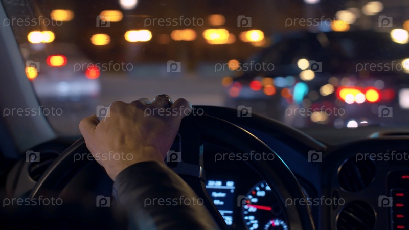 Закройте мужские руки за рулем автомобиля. Консоль и приборная панель подсвечиваются в темном салоне автомобиля во время ночного вождения. POV. Размытые огни на городской улице