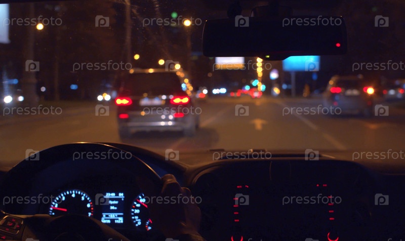 Закройте мужские руки на руле. Приборная панель загорается внутри темного салона автомобиля. ночное вождение в видео от первого лица