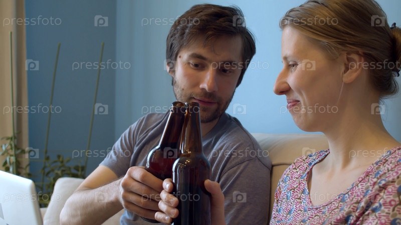 Пара чокается пивными бутылками