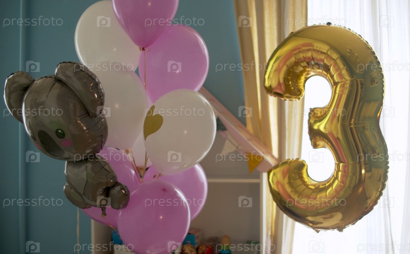 Воздушные шары на день рождения в светлой комнате. Воздушные шары, надутые гелием, слегка покачиваются на веревке. Золотой номер 3 и бурый медведь. Крупным планом
