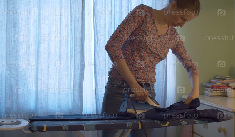 Привлекательная улыбающаяся женщина гладит брюки