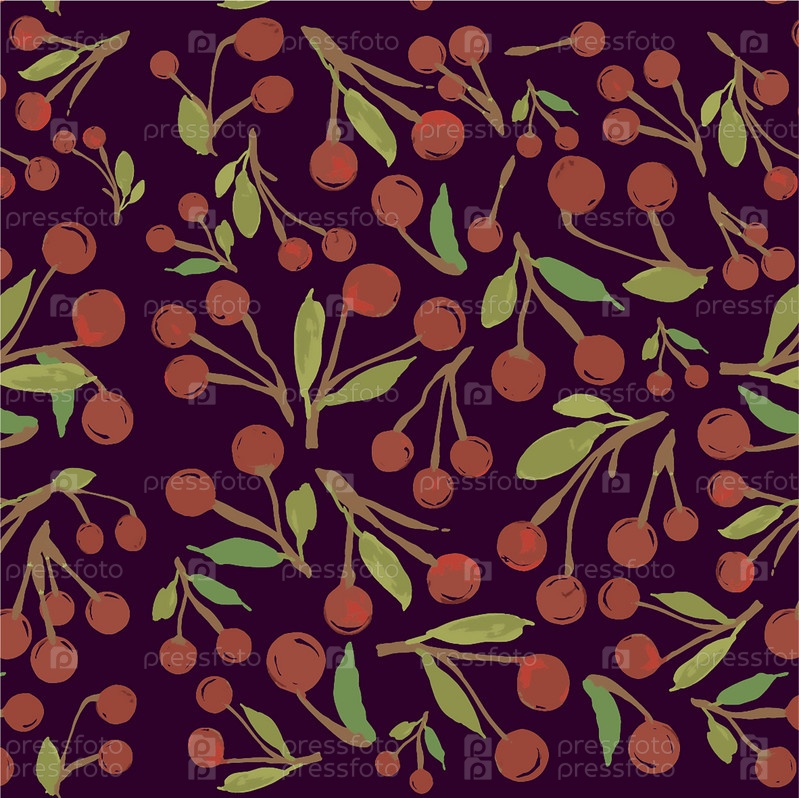 Цветной орнамент из вишни. Шаблон вишни на темном фоне. Ягодный узор с листьями на заднем плане. Вишни с листьями на заднем плане