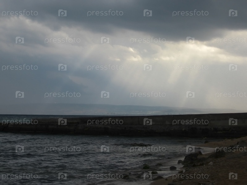 Морской пейзаж с лучами солнца сквозь облака, seascape with sun rays through clouds
