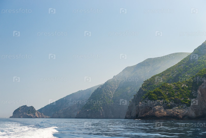Скалистое побережье греческого острова и вид на море, пейзаж греции вид с лодки