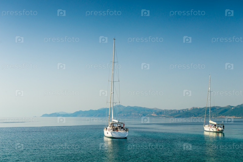 Лодки качаются на бирюзовых волнах Ионического моря Греции в солнечную погоду