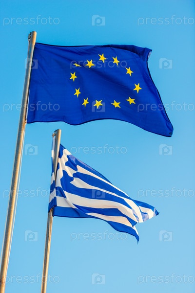 Отношения Греции и ЕС. Греческие и европейские флаги развеваются на ясном голубом небе