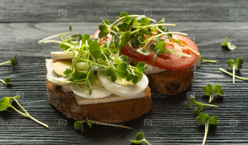 Бутерброды с сыром, помидорами и яйцом, посыпанные микрозеленью на деревянном столе